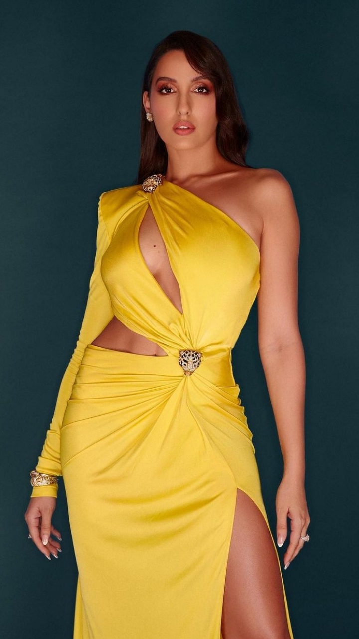 Nora looked hot in a yellow-hued thigh-high slit one-shoulder gown that featured unique cut-out detail. She accentuated her look with stud earrings, shimmery eye makeup, nude lips and open tresses.
