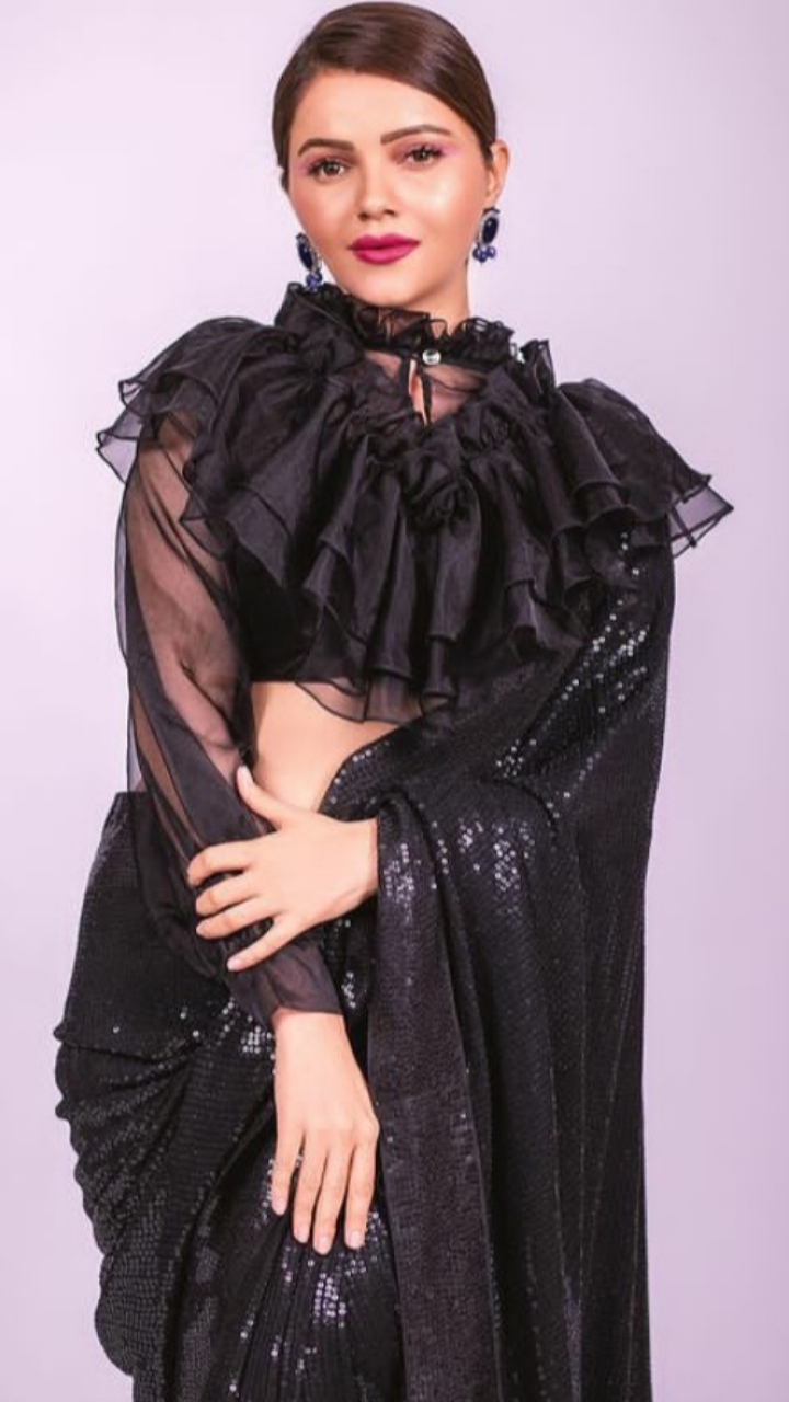 Rubina Dilaik exuded glamour in a sexy black sequin saree. She paired it with a statement black ruffle top. Rubina accentuated her look with black stone earrings and bold red lips.