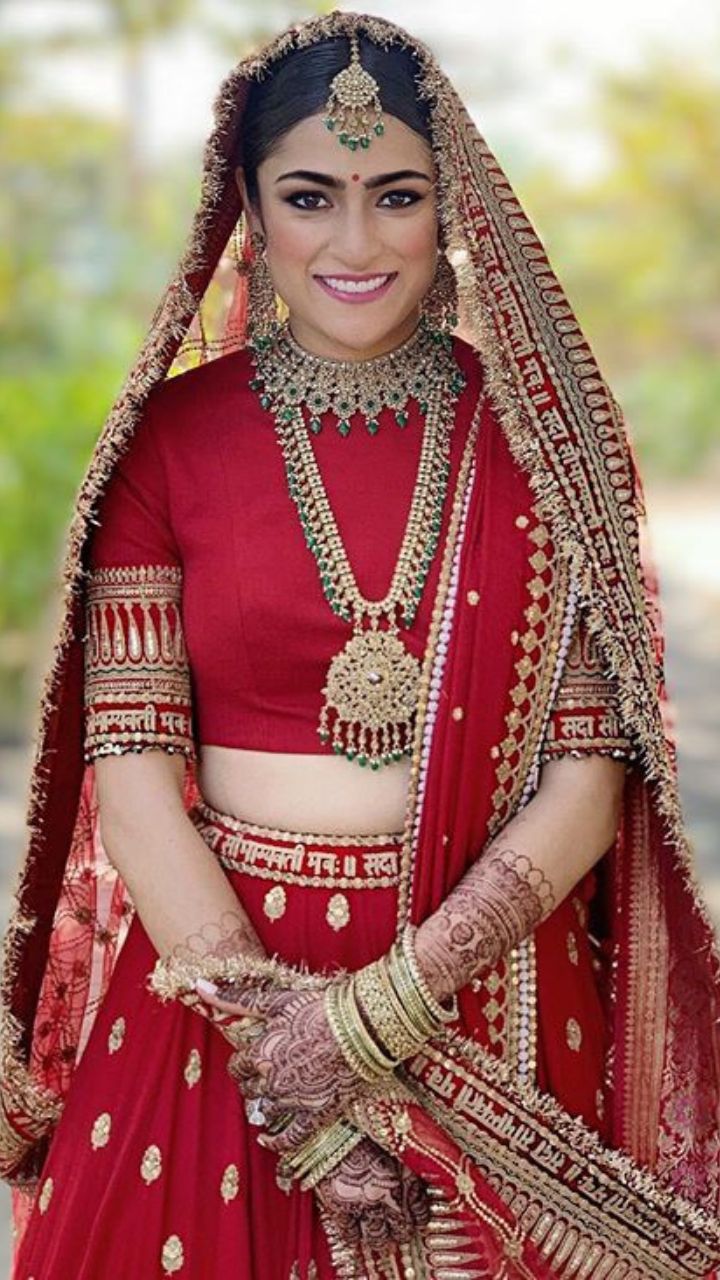 The bride donned a crimson red-hued lehenga that featured golden 'gotta' work on it. She paired it with a sheer red 'dupatta' that had a Sanskrit blessing inscribed tassel border.