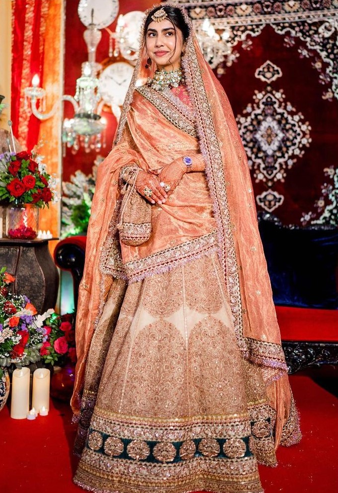 The Sabyasachi bride opted for a rust-peach-hued lehenga that featured stunning self-work on it. She paired it with a matching 'dupatta' that featured tassel work on it.
