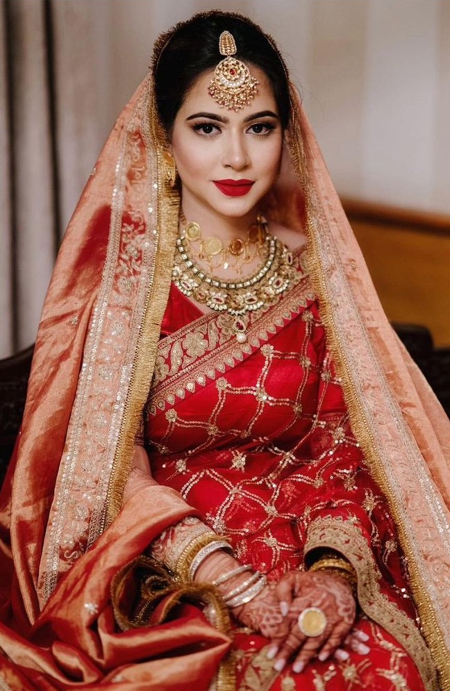 The bride opted for a classic red and gold-hued lehenga from Sabyasachi Mukherjee. She contrasted her deep red lehenga with a lighter-hued sheer red 'dupatta' with 'zari' detailing and gold tassels.