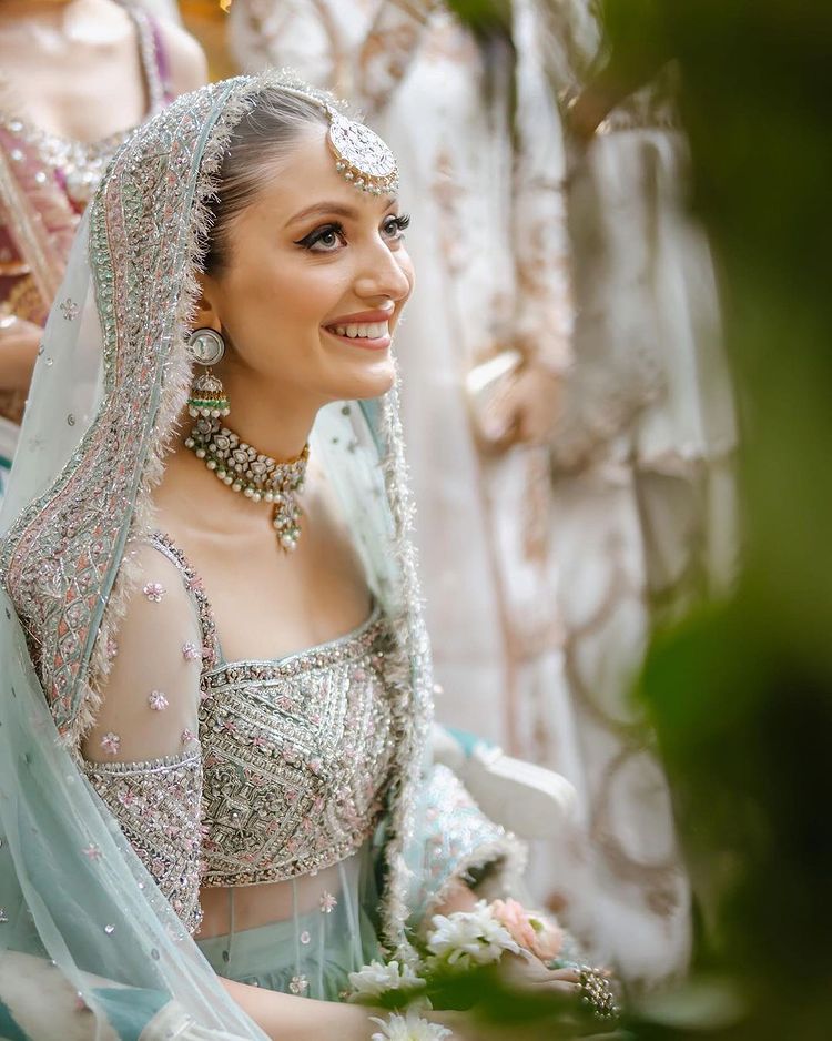 The bride looked gorgeous in an icy-green lehenga paired with a chiffon-netted 'choli'. She put up a matching 'zardosi' worked 'dupatta' which had tassel work on it.