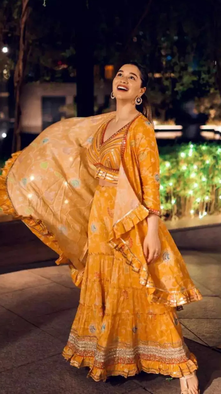 Sara looked stunning in a yellow-hued printed 'sharara' featuring lace detailing. She teamed it with a matching crop top, a shrug, a pair of earrings, glam makeup and a ponytail.