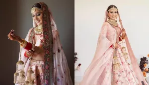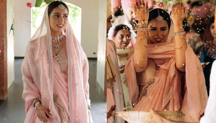 Tarun Tahiliani Bride Wears A Pearl-Studded Peach-Hued Lehenga, Pairs It With Three-Tiered Necklace
