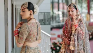 Designer Bride Wore A Pastel-Hued Peacock Motif Patterned Lehenga On Her Wedding Day