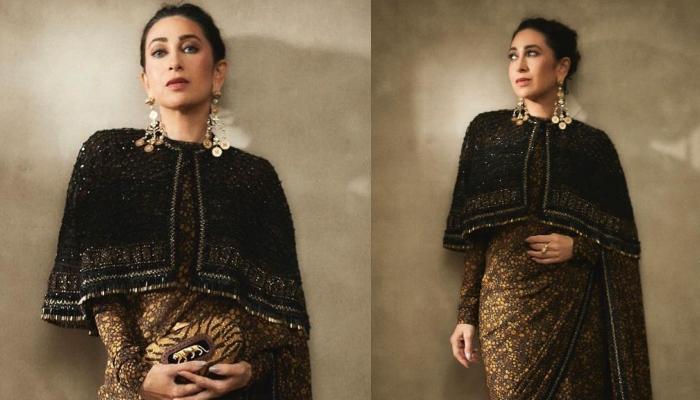 Karisma Kapoor Wore A Golden Sabyasachi Saree Paired With Black Cape, Tiger Earrings And A Clutch