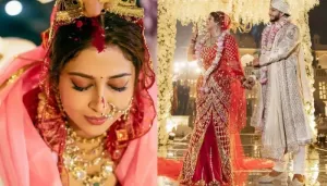 Sonarika Bhadoria Ties The Knot With Vikas Parashar, Looks Regal In Red And Gold Embroidered Lehenga